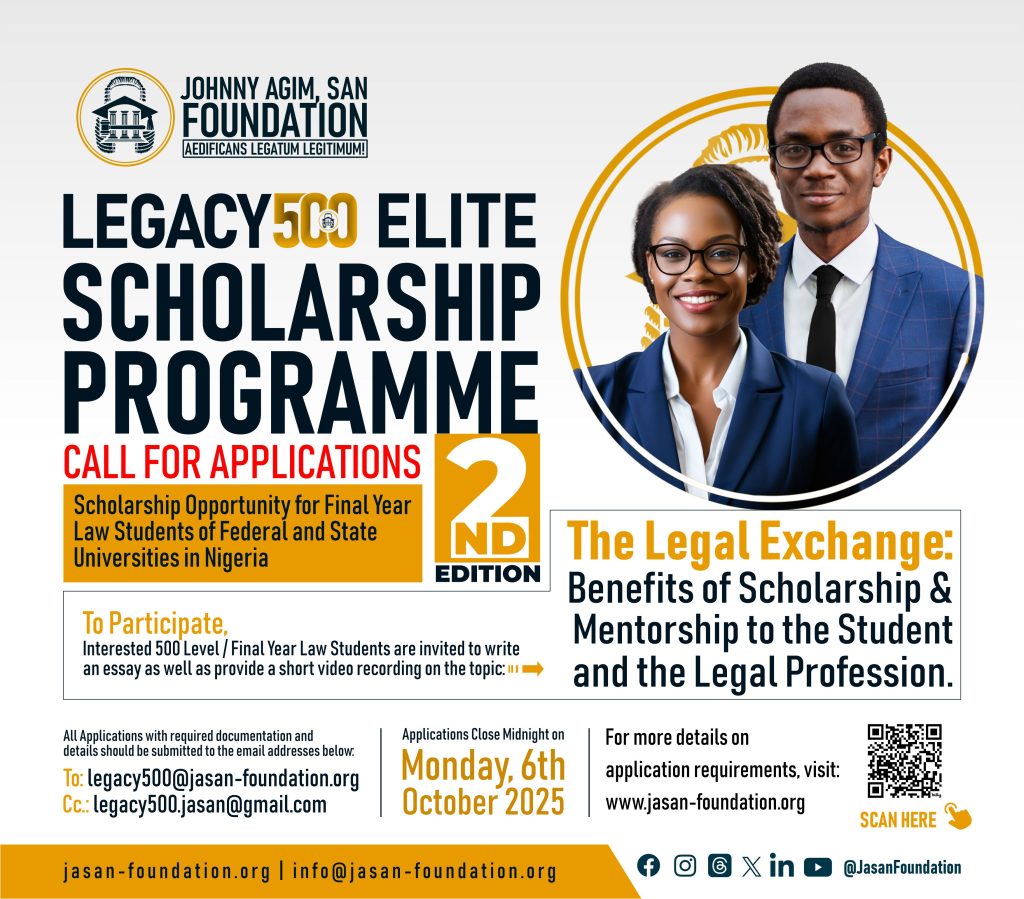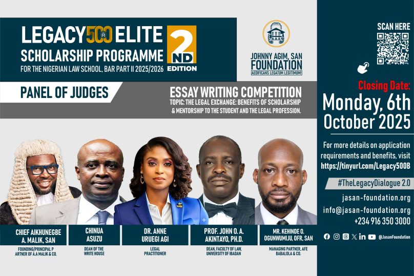 The Johnny Agim, SAN Foundation (JASAN Foundation) is delighted to formally announce the distinguished Panel of Judges for the 2nd Edition of the#Legacy500 Elite Scholarship Programme and Essay Competition, exclusively designed for final year (500 Level) Law Students of Nigerian Federal and State Universities.