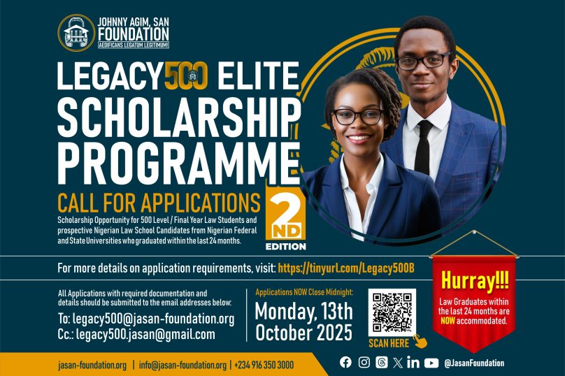 #JASANFoundation #JohnnyAgimSAN #Legacy500 #LawSchoolScholarship #NigerianLawSchool #BarPartII #LegalScholarship #MentorshipMatters #LawStudentsNigeria #ScholarshipOpportunity #FutureLawyers #LegalEducation #LawMentorship #EssayCompetition #CallForApplications