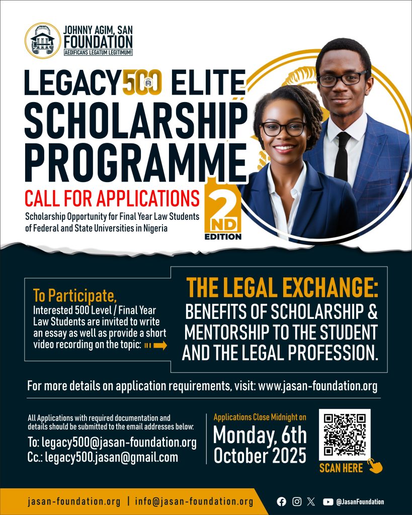 #JASANFoundation #JohnnyAgimSAN #Legacy500 #LawSchoolScholarship #NigerianLawSchool #BarPartII #LegalScholarship #MentorshipMatters #LawStudentsNigeria #ScholarshipOpportunity #FutureLawyers #LegalEducation #LawMentorship #EssayCompetition #CallForApplications