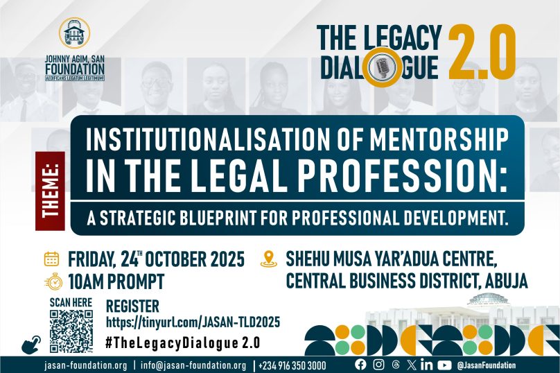 The Johnny Agim, SAN Foundation [JASAN Foundation] is pleased to invite you to #TheLegacyDialogue 2.0, the second edition of JASAN Foundation’s annual flagship strategic think-tank to drive legal and judicial reform and advocacy in Nigeria.
